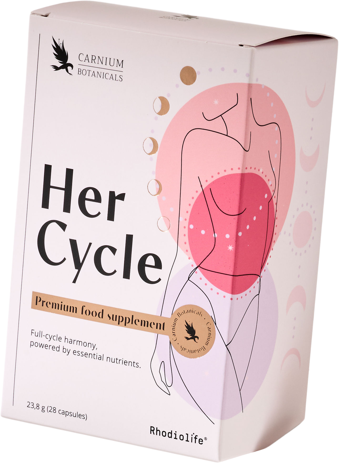 Her Cycle znamke Carnium Botanicals je prehransko dopolnilo, ki optimalno podpira naravne cikle žensk. Veganske kapsule brez glutena so formulirane glede na štiri faze cikla (menstruacija, folikularna faza, ovulacijska faza, lutealna faza) in so pakirane v različne pretisne omote.