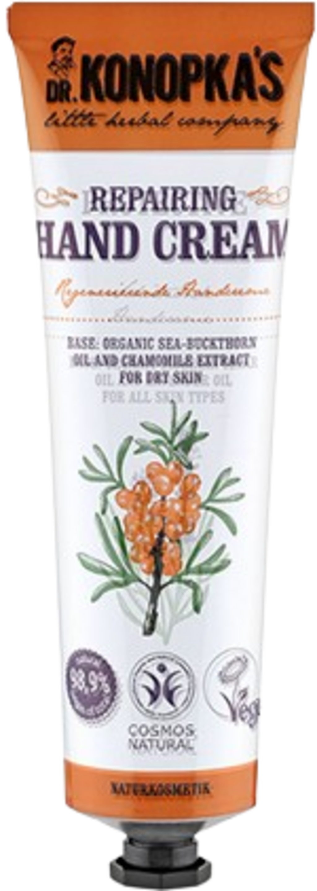 Ta krema za roke temelji na formuli Dr. KONOPKA za intenzivno nego suhe kože. Vsebuje hranljiv organski rakitovec, ki kožo navlaži, ter hranljiv in blažilni izvleček kamilice.