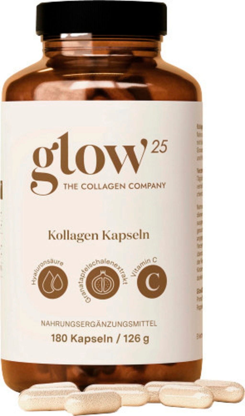 Kolagenske kapsule znamke Glow25 združujejo visokokakovostne kolagenske peptide s hialuronsko kislino, izvlečkom lupine granatnega jabolka in naravnim vitaminom C. Vitamin C prispeva k normalni tvorbi kolagena za normalno delovanje kože. Kapsule so idealne kot prehransko dopolnilo ali kot priročna alternativa kolagenu v prahu – odlične so za vsakodnevno uživanje ali za na poti.