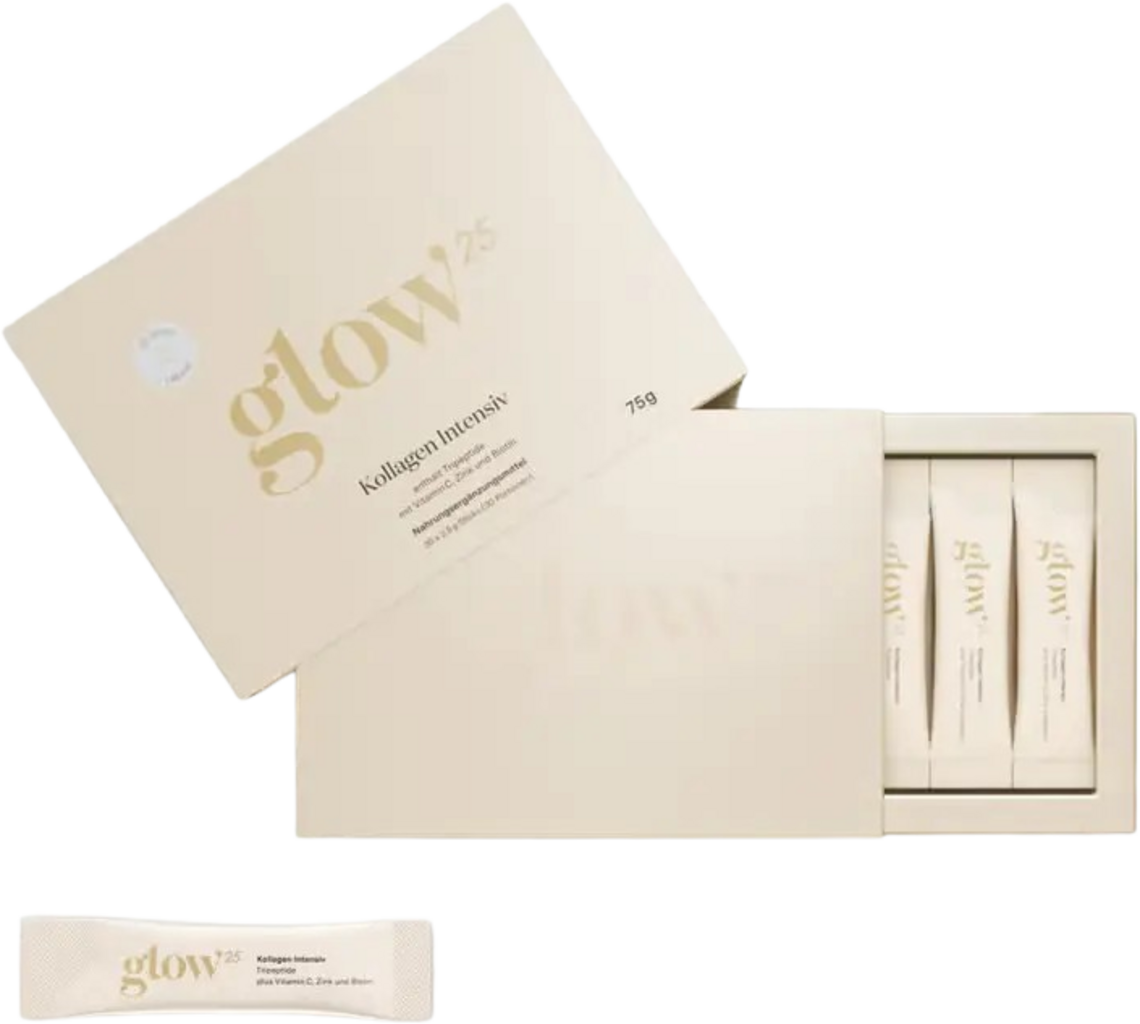 Formula praška Collagen Intensive znamke Glow25 se ponaša z inovativno tripeptidno formulo, v kateri se majhni kolagenski tripeptidi (cca. 500 daltonov) optimalno razgradijo zaradi encimske razgradnje. To omogoča telesu, da kolagen še posebej hitro absorbira. Prašek je brez okusa in dodatno obogaten z vitaminom C, cinkom in biotinom (znanim tudi kot vitamin H).