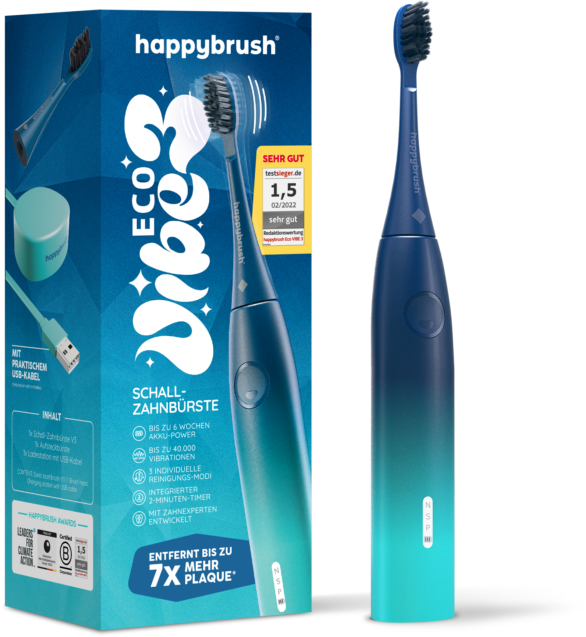Ta električna zobna ščetka znamke happybrush s svojo zvočno (sholl) tehnologijo zagotavlja do 40.000 vibracij. Glava ščetke ima trojno zvite ščetine. Naprava navdušuje z vzdržljivostjo baterije do šest tednov. Zobna ščetka ponuja tri individualne načine čiščenja: običajno, nežno in poliranje. Vgrajen časovnik vam pomaga enakomerno očistiti vse kvadrante. Zahvaljujoč funkciji Travel Lock (potovalni zaklep) je izdelek enostaven za transport.