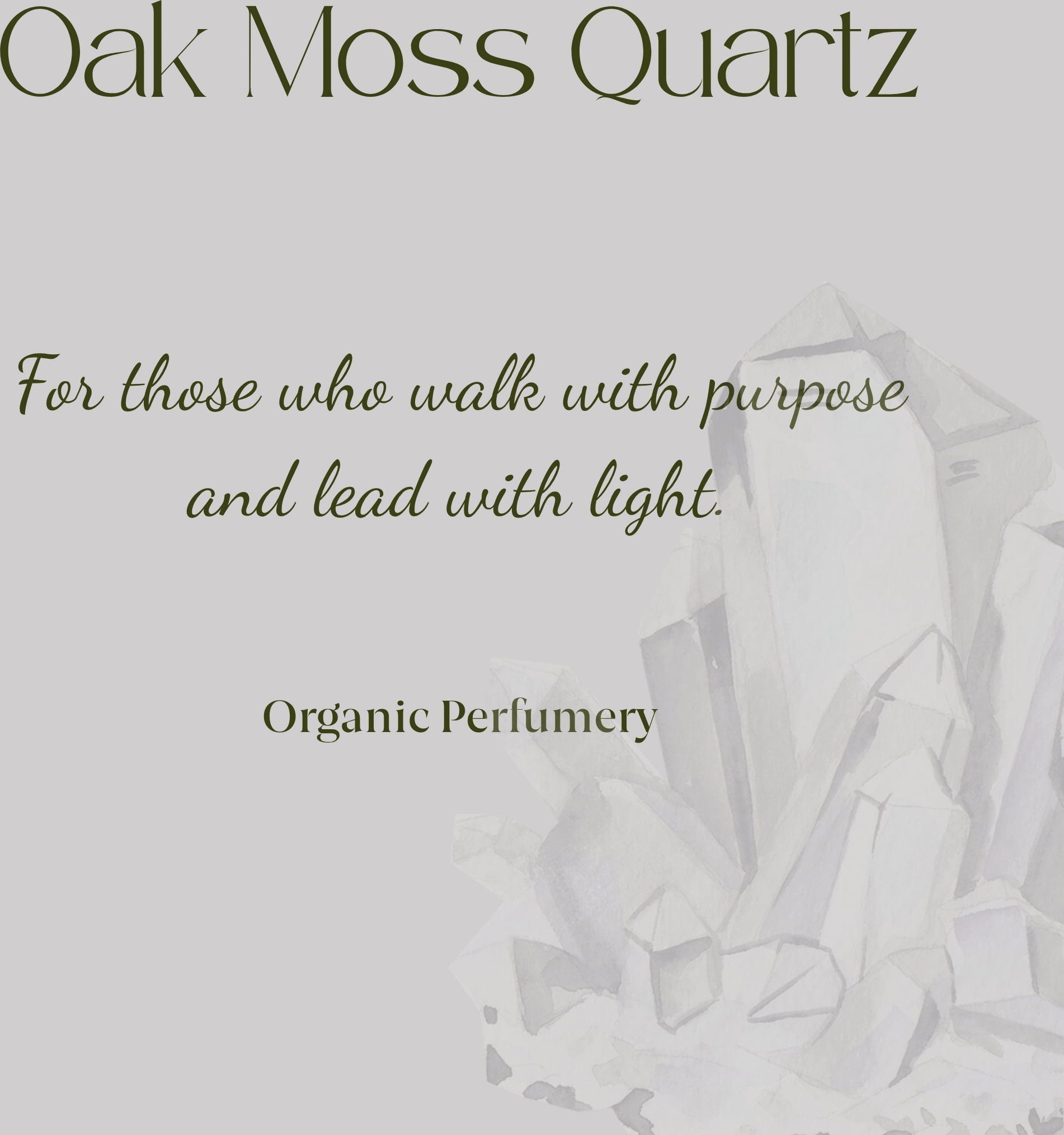 Oak Moss Organic Crystal Energy Perfume je dišava s prefinjeno prisotnostjo in čisto esenco. Ta kombinacija cvetja in mahu, ki jo je navdihnil dimni kremen (morion), izraža notranjo moč, treznost in čistost.