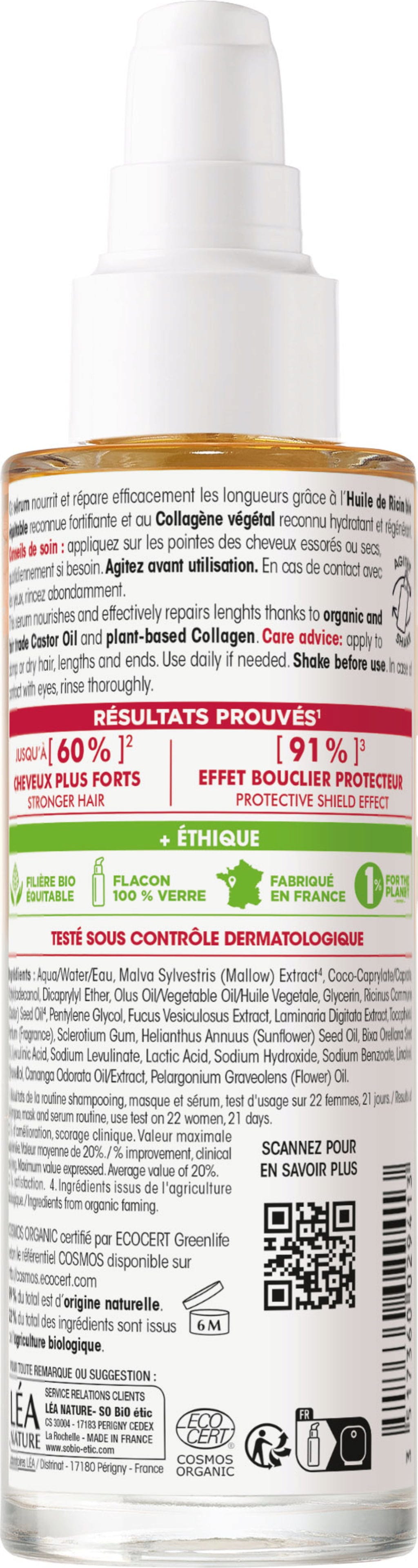Ta serum neguje poškodovane in obremenjene dolžine in konice las zaradi inovativne formule s pravično pridelanim ekološkim ricinusovim oljem in rastlinskim kolagenom. Lasnim vlaknom zagotavlja trajno vlago in jo varno zapira.