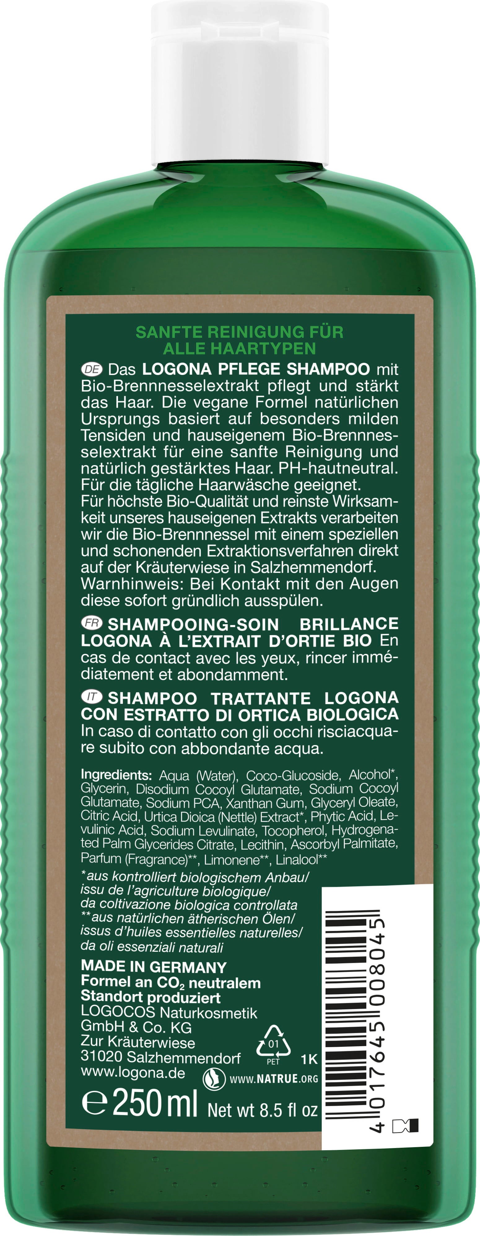 Z negovalnim šamponom znamke LOGONA lahko nežno očistite lase. Vitalizacijske sestavine iz bio izvlečkov koprive podajo lasem sijaj ter prožnost.