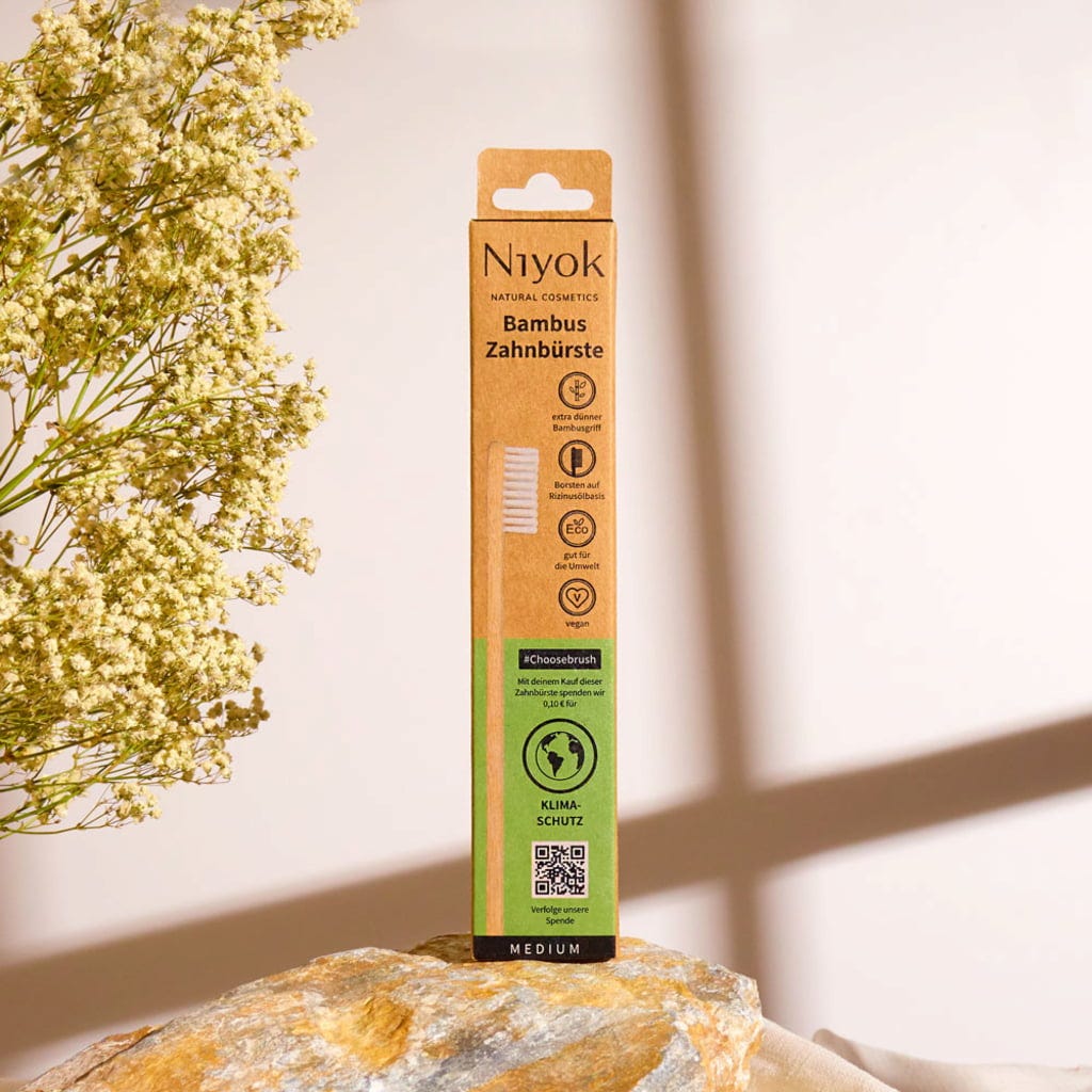 Zobna ščetka je izdelana iz trajnostnega bambusa in ima ščetine iz ricinusovega olja. Za srednje trdne ščetine. Celoten izdelek je veganski in pomaga zmanjšati odpadke. Ko je ščetka odslužila odlomite glavo in to odstranite med ostale odpadke. Ročaj lahko odvržete v bio odpadke.
