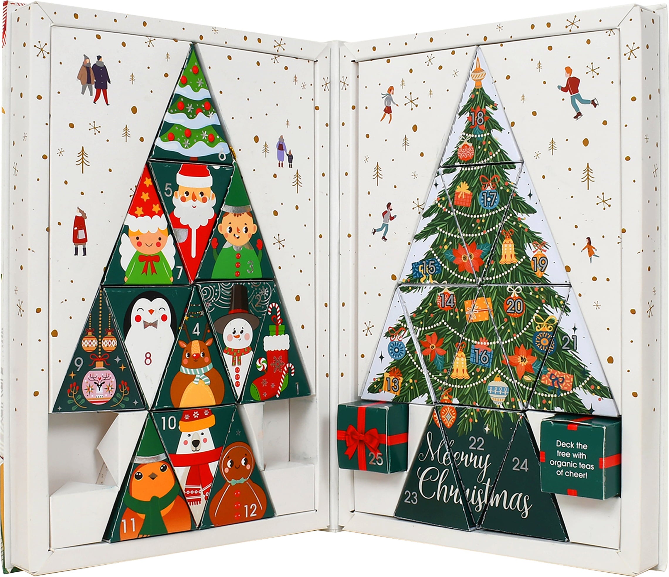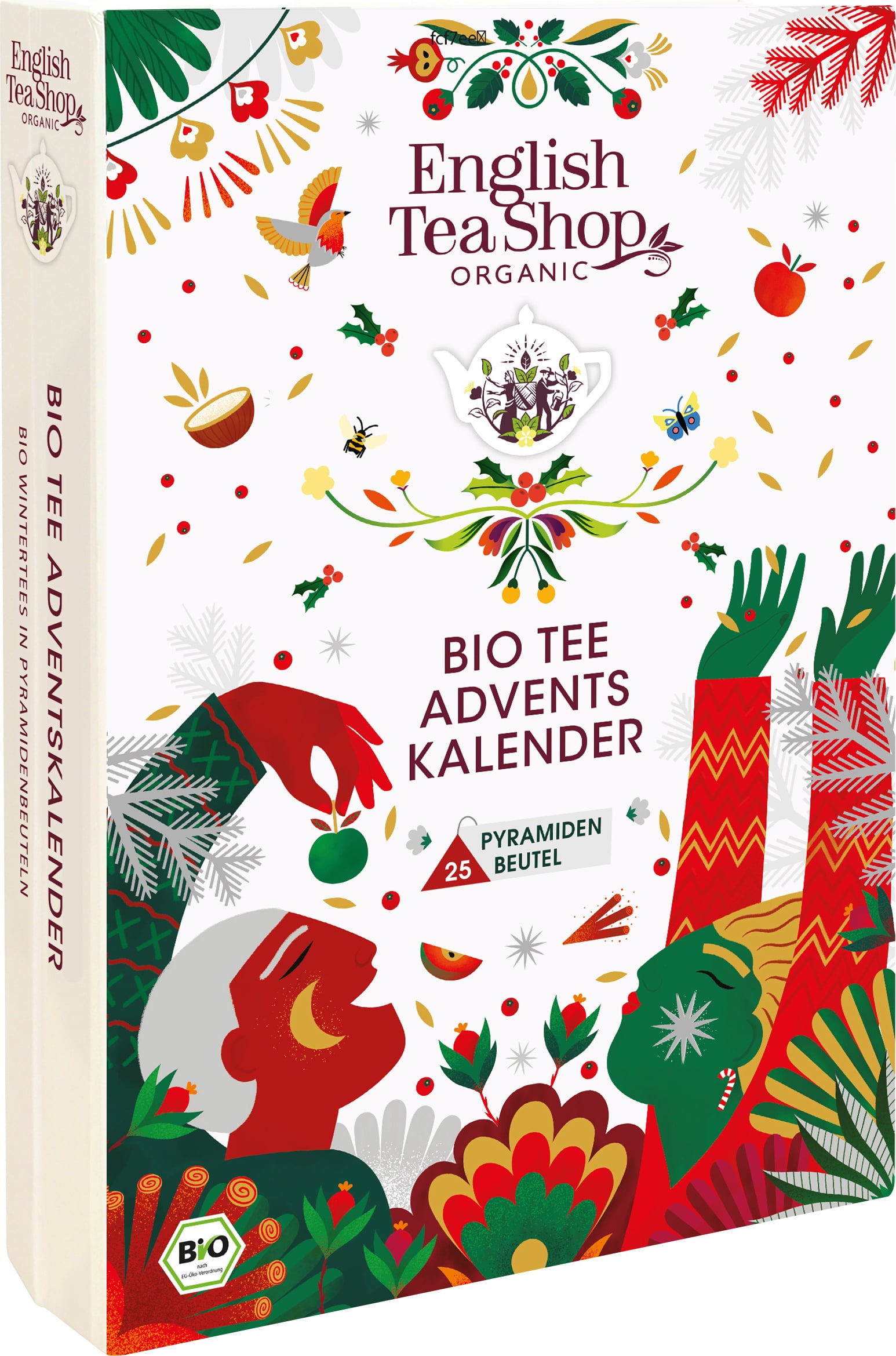 Adventni koledar velikega formata podjetja English Tea Shop se odpre kot knjiga in razkrije zbirko posebej aromatičnih presenečenj. Vsebuje 25 izvrstnih ekoloških čajev v piramidnih vrečkah, ki jih je mogoče kompostirati, ki vsak dan nudijo zaslužen oddih. Praznična poslastica, ki razvaja vse čute!