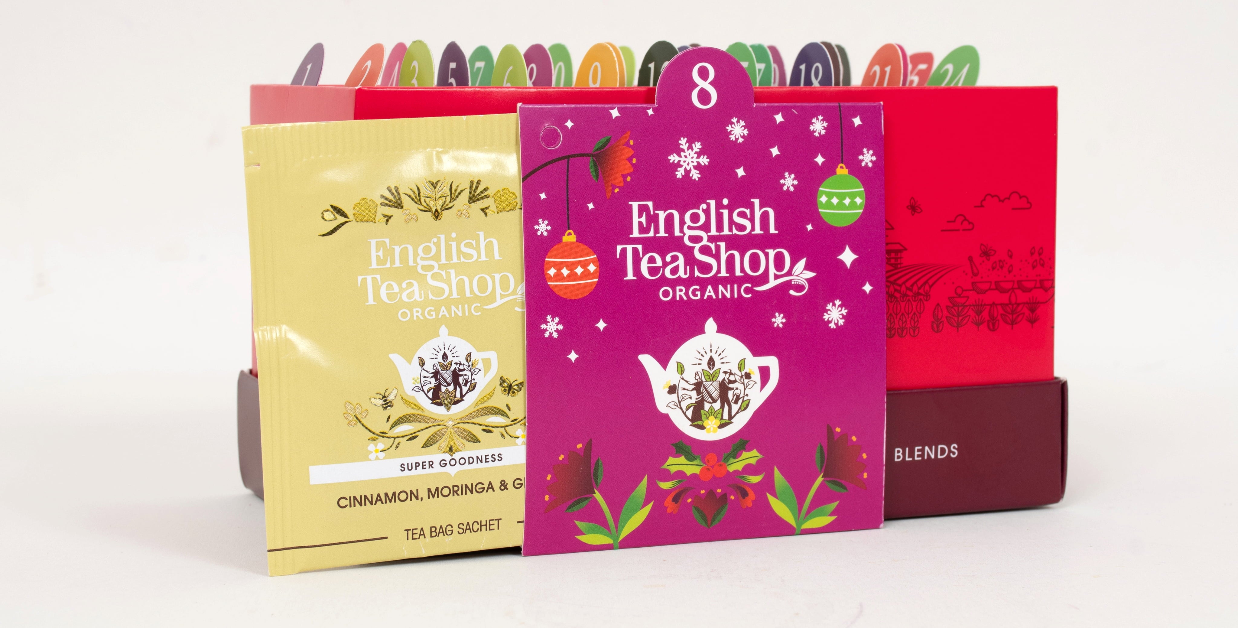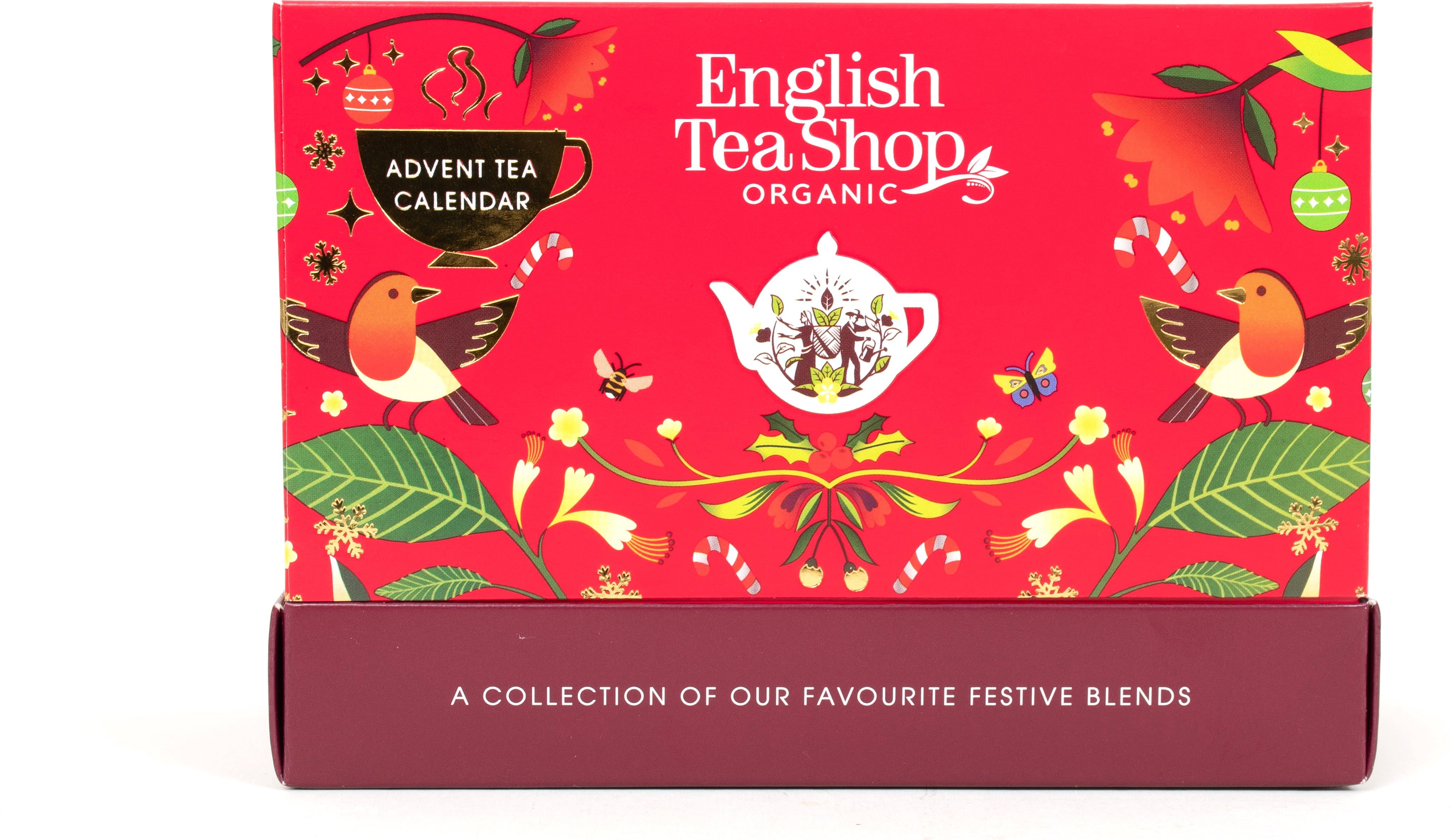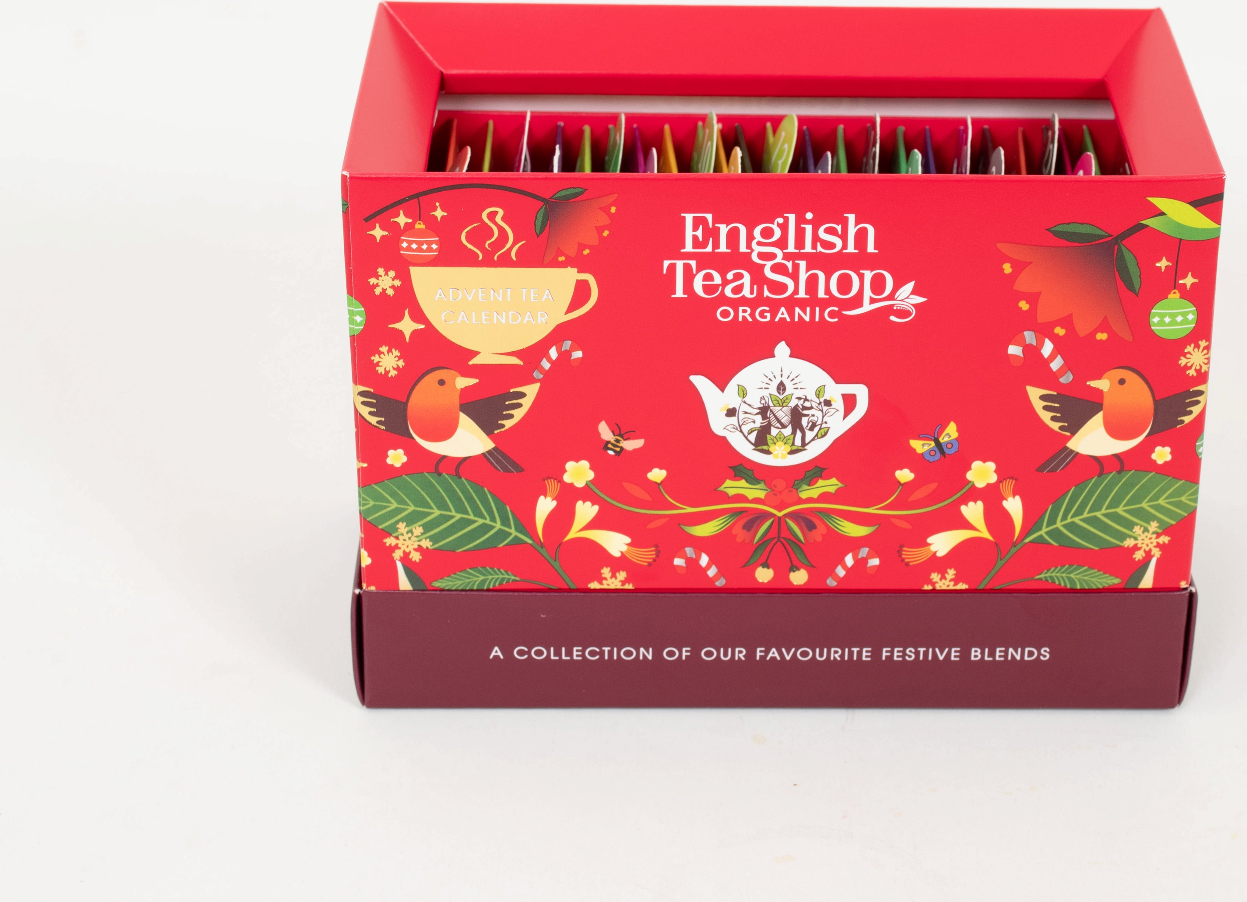 Kreativno oblikovan adventni čajni koledar "Christmas Countdown" podjetja English Tea Shop spominja na elegantno škatlo za voščilnice. Vsebuje 24 izvrstnih aromatičnih čajev v vrhunski ekološki kakovosti. Idealno darilo za popestritev adventnega časa nekomu posebnemu.