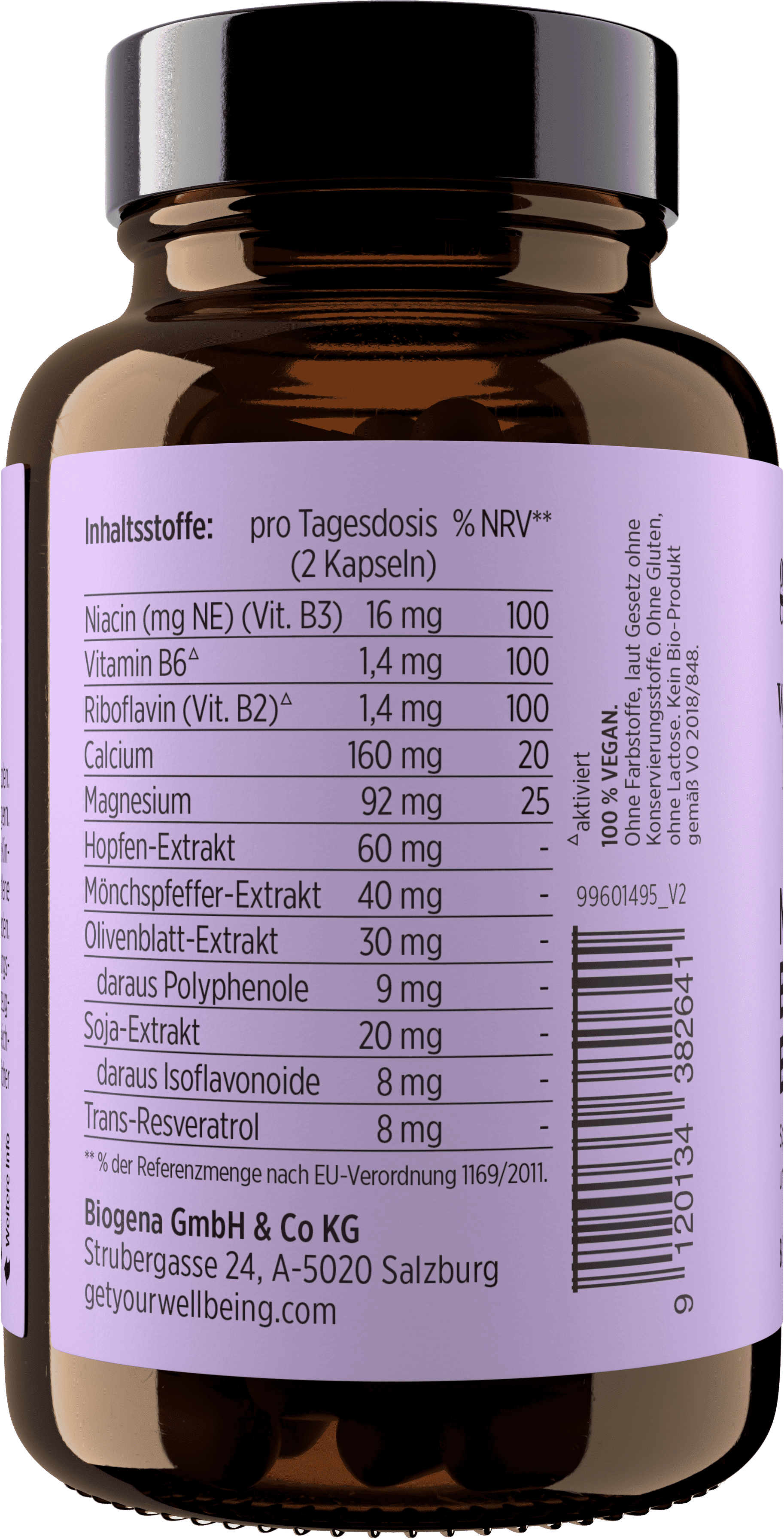 kalcij koral, magnezijev citrat, magnezij (kot oksid), magnezijev glukonat, Magnesiumcarbonat, hidroksietilmetilceluloza (ovoj kapsule), celulozni prah, izvleček hmelja, Navadna konopljika (Vitex agnus-castus), Izvleček listov oljke, Izvleček soje, nikotinamid, Trans-resveratrol, piridoksal 5‘ fosfat, natrijev riboflavin-5'-fosfat