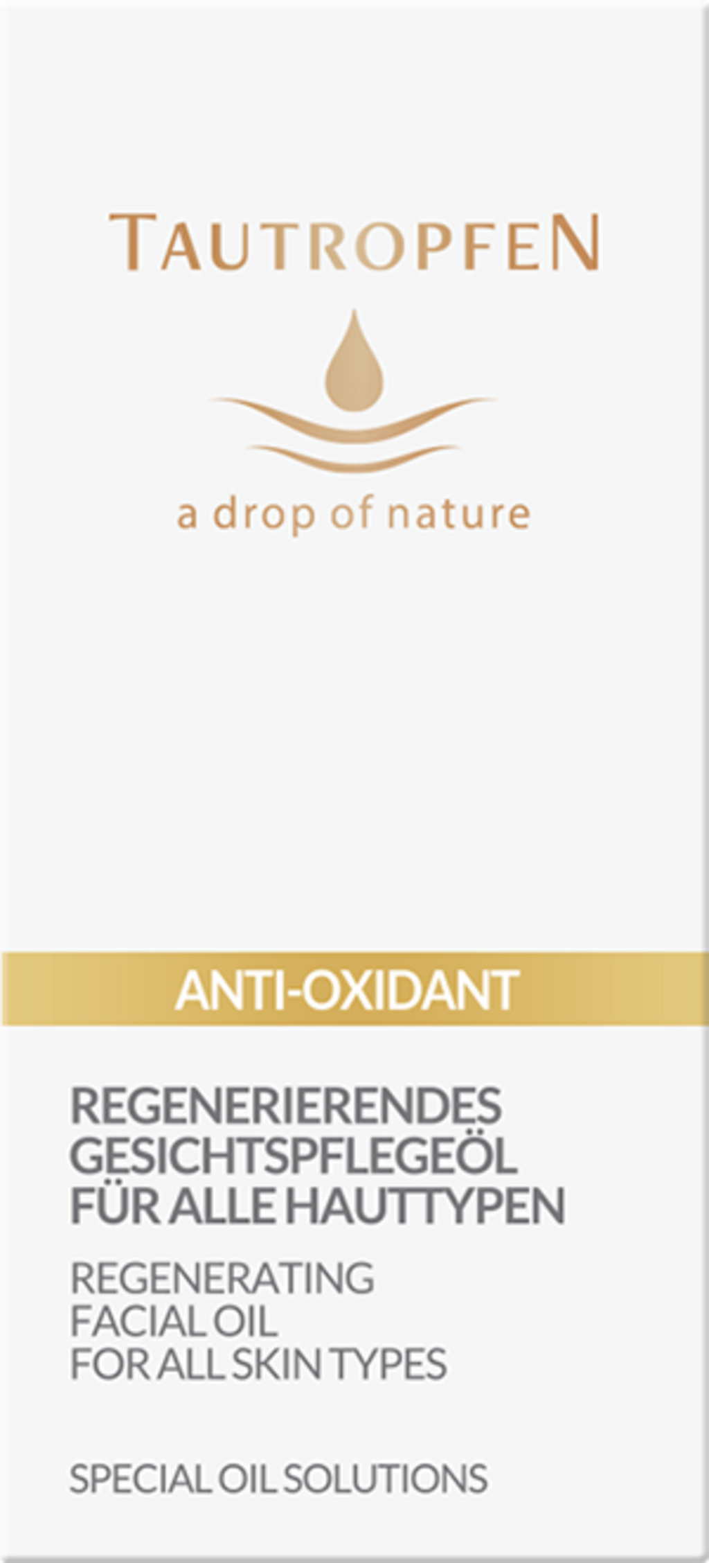 To dragoceno olje za obraz znamke TAUTROPEN je skrivnost med olji za obraz. Vsebuje dragocena rastlinska olja granatnega jabolka, amaranta, šipkovih semen in mandljev za žametno gladkost, hidrirano kožo in obnovo celic. Poleg tega zahvaljujoč skrbno izbranim sestavinam, kot sta koencim Q10 in RosamoxTM , izdelek ima antioksidativne lastnosti in tako lahko preprečuje staranje kože, ki ga povzročajo okoljski dejavniki.
