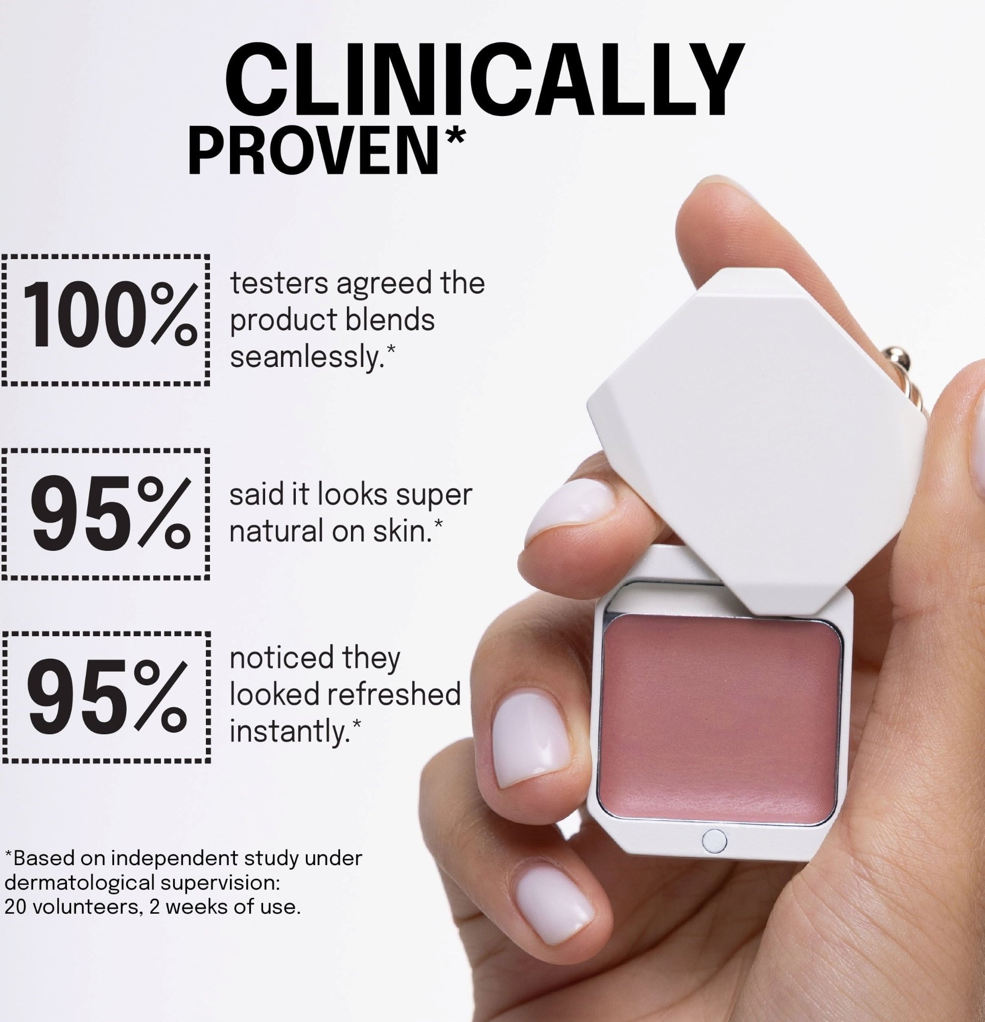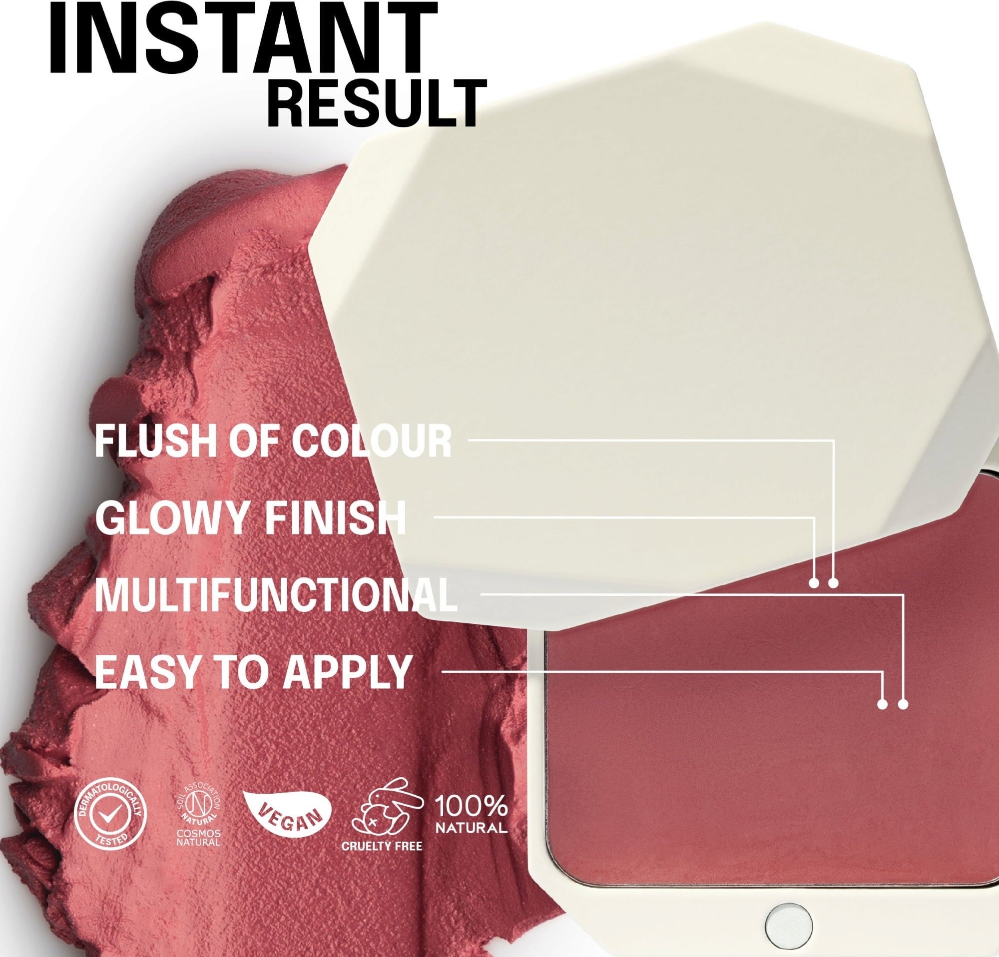 - Za enobarvni videz nanesite izdelek na lica in ga nanesite na ustnice.