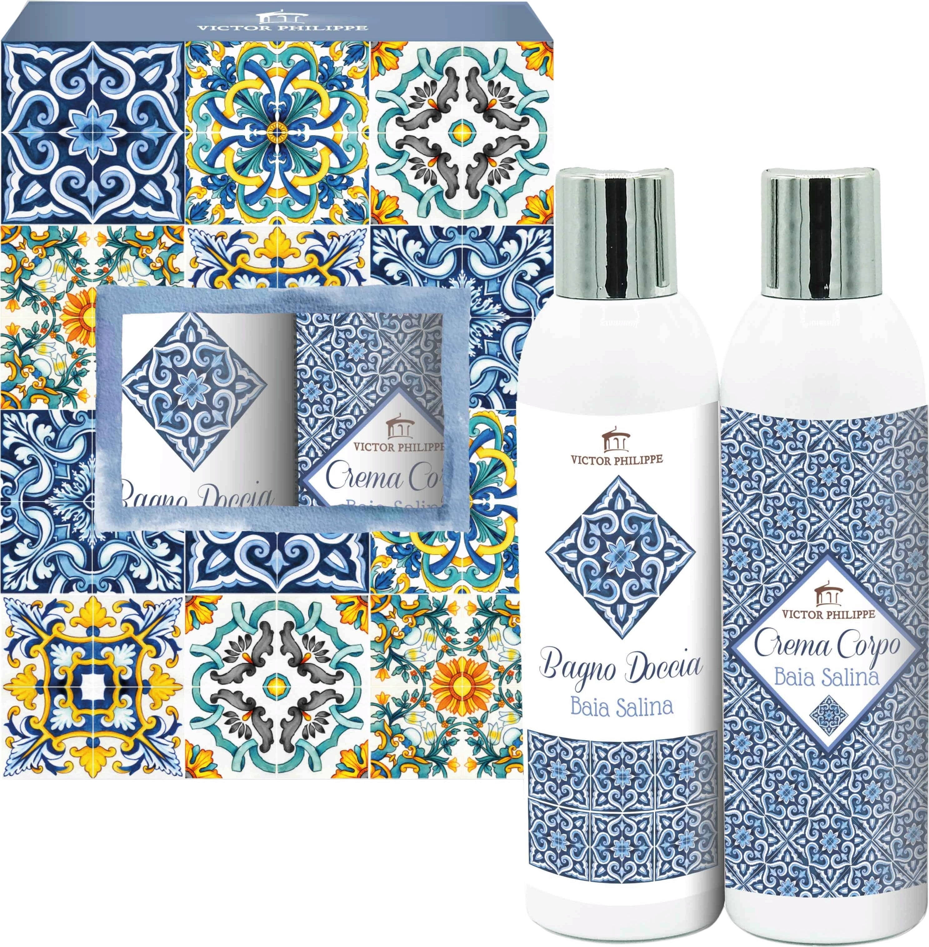 Darilni set Baia Salina združuje svežino morja in lahkotnost poletja v vašem vsakodnevnem lepotnem ritualu z gelom za prhanje in kremo za telo. Komplet, ki ga grafično navdihujejo ploščice azulejos, z oblikovanjem in poživljajočim vonjem morskega vetra slavi čar Sredozemlja.